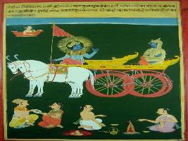 | Description / विवरण | Miniature painting based on Shri Bhagwat Gita. It depicts Krishna and Arjun where Krishna says that the creation is like cycle and in order to understand it a man should has control over heart and mind. |