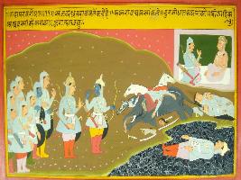 | Description / विवरण | Miniature painting based on Mahabharat - Gada parva. On the painting Sanjay says to Dhritrashtra thatDruyuodana is resting in the lake and Pandavas Krishna and their army is seen in the bank of the lake. |