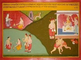 | Description / विवरण | Miniature painting based on Mahabharat - Virat parva. The king Virat is depicted sitting in palace with an attendant, a Brahman is depicted performing yagna for Shiv, two Brahmans are depicted performing yagna and two wrestlers are fighting. |