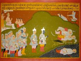 | Description / विवरण | Miniature painting based on Mahabharat - Gada parva. It is depction of that scene when Duryodhan hidden in the pond, when all his major fighters are dead. Krishna and Pandavas arrived in the pond and they are asking, Duryodhan to come out and right. |