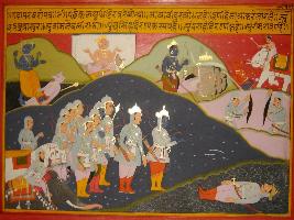 | Description / विवरण | Miniature painting based on Mahabharat - Gada parva depicting scenes from Gada parva. Krishna is telling Yudhisthir that Duryodhan has tantric powers so he should be killed by trick, such as Indura killed Vritasur, Vamana anmihilated Bali, Narasimha killed Hiranya Kasyap, Varaha killed Hiranyaksa and Ram killed Ravan. |