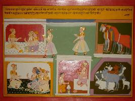 | Description / विवरण | Miniature painting based on Mahabharat - Virat parva. Yudhisthir is depicted taking food with four brothers, Bhim is depicted preparing food. A cowshed and a stable also is depicted. |