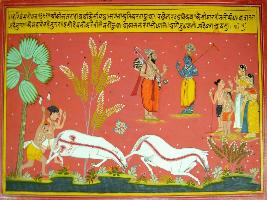 | Description / विवरण | Miniature painting based on Harivansha depicting on the upper part Krishna talking to a man holding veena. In the lower part, two men are depicted hunting horse. |