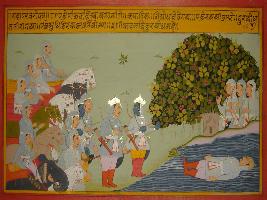 | Description / विवरण | Miniature painting based on Mahabharat - Gada parva, Pandavas have arrived at the palace where Duryodhan was hiding, the fighters came down of Chariots and went to the place where Duryodhan was hiding and telling Yudhisthir that here Duryodhan is hiding. |
