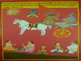 | Description / विवरण | Miniature painting based on Shri Bhagwat Gita. It depicts Krishna and Arjun where Krishna says that the man who only do his Karma he never about Karma and its results. |