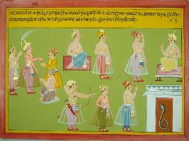 | Description / विवरण | Miniature painting based on Mahabharat - Udyam parva depicting Bindura is telling his son that if he will respect people than no one will be his enemy and if he is with other people then people will throw him out from his Kula . |