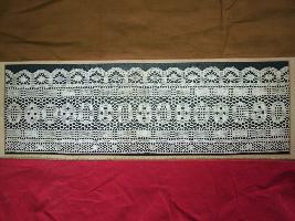 | Description / विवरण | Specimen of Nottingham machine made lace, locally called Tatting Lace with alternate geometrical pattern use on it and also floral designs are used on it. It is a net lace. The down portion is designed with sea waves and architectural pattern |