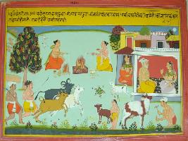 | Description / विवरण | Miniature painting based on Harivansha depicting a scene in which two sages are performing yagna. Right below, two men are herding cows. Left top a lady is talking to an old man in the palace. |