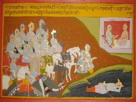 | Description / विवरण | Miniature painting based on Mahabharat - Gada parva depicting scenes from Gada parva Sanjay is telling Dritarastra that Yudhisthir along with his brothers and Dristadumna are going towards the palace where Duryodhan is hiding. |