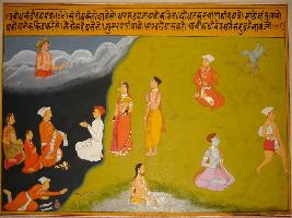 | Description / विवरण | Miniature painting based on Sanskrit drama - Prabodh Chandrodaya depicting Dharamraj coming from the cloud at the Upper right. Below him, a man is sitting with family and writing record and in front of him a man is sitting with folded hands. Below this, the man is shown lying unconscious. This scene depicts the rise of greed in man. At the middle, a Brahman is shown standing with his wife. Below this, a sage is standing in water, to his left a sage is sitting. |