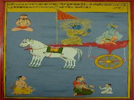 | Description / विवरण | Miniature painting based on Shri Bhagwat Gita. It depicts Krishna and Arjun where Krishna says that the man who do his duties without have any attraction to other he is the perfect man. |