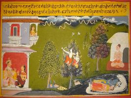 | Description / विवरण | Miniature painting based on Prithviraj Raso. Indravati telling the king about the season. She is telling king that in this season lightening and thunder occur, birds are flying back to the nest, deers are running and Vishnu and Lakshmi are sleeping on Sheshnaag. |