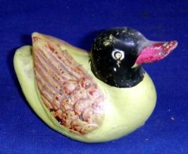 | Description / विवरण | Small duck made of paper mache. It has read beak, black head, brown wings and light green body. Grains are filled inside to make rattling sound. |