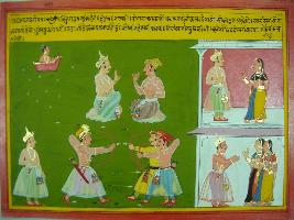| Description / विवरण | Miniature painting based on Mahabharat - Udyam parva. It depicts Bindura is telling his son that duty of warrior is to fight. A person is coward if he retrain from his duty. Then he asked him to fight with enemy and says if he will succeed in war, then 100girls from Veerdesh will welcome him and pray for him. |