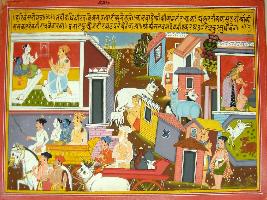 | Description / विवरण | Miniature painting based on Harivansha depicting Baldev talking to Krishna and his friend. In left side top cows have been shown, Yashoda is preparing Makhan and Krishna watching. In right side, Krishna and Baldev shown seated on rath, below Nanda is seated on cart. |