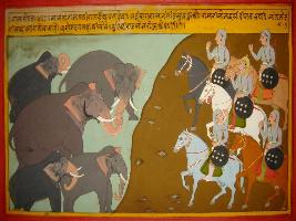 | Description / विवरण | Miniature painting based on Prithviraj Raso depicting army and nobles of Prithviraj becoming happy by seeing the arrival of Prithviraj in the battle field and in the way trunk is prominent in an elephant Prithviraj is prominent in the battle field. |