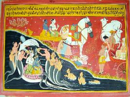 | Description / विवरण | Miniature painting based on Harivansha depicting Krishna and Baldev sitting in chariot and a king paying courtesy. Nanda is shown in his cart in the left side. In the lower part Krishna and Baldev are seated on Sheshnaag in a river and nag purush are paying homage to them. |