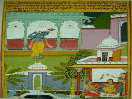 | Description / विवरण | Miniature painting based on Rasikpriya depicting Krishna playing flute in the upper part of the painting, while Radha is seen in the lower part and one of her friend informs her about Krishna. |