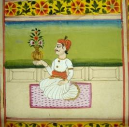 | Description / विवरण | Miniature painting depicting a man seated on mat and holding a flower vase in right hand. The painting is decorated with floral border. It is symbol of Zodiac sign-Aquarius. |