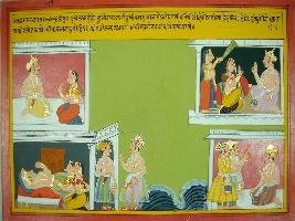| Description / विवरण | Miniature painting based on Mahabharat - Udyam parva depicting Bindura is forcing his son to fight in war but his son is denying for fight. |