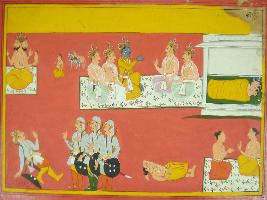 | Description / विवरण | Miniature painting based on Mahabharat - Gada parva depicting Kartikeya at the upper right corner. At the upper centre Pandavas are in conversation with Krishna. At the lower right Duryodhan is talking to Kripacharya and Ashwatama. |
