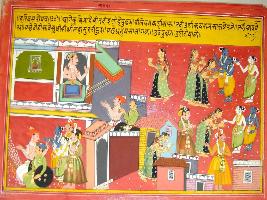 | Description / विवरण | Miniature painting based on Harivansha depicting Kansa talking to two persons at the upper right corner. The same two persons are seen with Krishna. At the left side Krishna and Balram are meeting many females and men. |