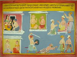 | Description / विवरण | Miniature painting based on Mahabharat - Udyam parva depicting Bindura is telling his son that he has a curse of a Brahman that he will be defeated in war for once so he has to fight a battle. |