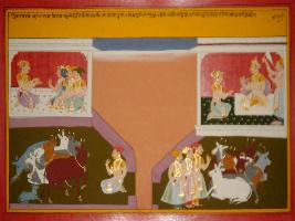| Description / विवरण | Miniature painting based on Mahabharat - Virat parva. On one side Yudhisthir is depicted with his brothers, on the other side Sahdev is depicted with Raja Virat. Sahdev is then depicted in cowshed as he was given the work to keep the cows well. |
