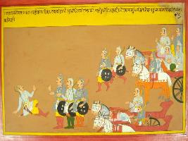 | Description / विवरण | Miniature painting based on Mahabharat - Gada parva. Duryodhan is depicted lying on the sand and three person Kritvavma, Kripacharya and Aswathama is depicted standing in front of him. Some peoples also depicted coming on chariot to meet him. |