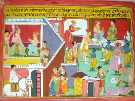 | Description / विवरण | Miniature painting based on Harivansha depicting Kansa, talking to a noble and two women in the right side. The painting depicts different activities of Krishna in Mathura in the left side. |