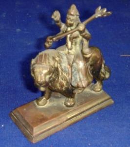 | Description / विवरण | Small brass figure of four armed goddess Durga sitting on lion s back. The trident is prominent. It is kept on a rectangular platform. |