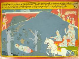 | Description / विवरण | Miniature painting based on Mahabharat - Gada parva. Duryodhan is depicted lying on the sand of bank and he is surrounded by demon birds and on chriot Kritvarma, Kripacharya and Aswathama is depicted coming. |