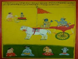 | Description / विवरण | Miniature painting based on Shri Bhagwat Gita. It depicts Krishna preaching Arjun that through Karma one can attain all three Lokas. |