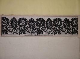 | Description / विवरण | Specimen of Nottingham machine made lace on net base, locally called, Black Silk Guipure cripple floral designs with four big leaves. Five flowers designed on it with leaves. |