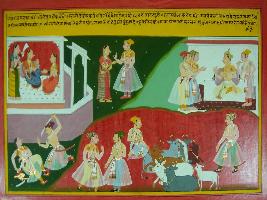 | Description / विवरण | Miniature painting based on Mahabharat - Virat parva depicting Draupadi says to Sudesna that he who will touch or tease her will be killed by her husbands. It also depict Sahdev come to the court of Virat and introduce himself as Boispa, who had looked after the cows of Yudhisthir. |