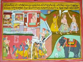 | Description / विवरण | Miniature painting based on Harivansha depicting at the lower corner Krishna breaking the bow and entering Mathura, at the entrance of which an elephant is seen. At the upper right females and Kansa watching it. At the upper left part Kansa is seen going to meet Krishna. Two attendants are seen with him. |