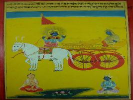 | Description / विवरण | Miniature painting based on Shri Bhagwat Gita. It depicts Krishna preaching Arjun that if he will not exist in Karma nobody will perform Karma. He again says that in everything the whole living being follows him. |