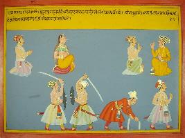 | Description / विवरण | Miniature painting based on Mahabharat - Udyam parva depicting Bindura is telling his son that the king who is brave and conquered many enemies his subjects will get happiness and lead happy life. |