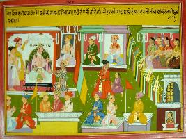 | Description / विवरण | Miniature painting based on Harivansha depicting the court of Maharaja Kansa where Kansa is sitting on the throne, while the other parts of the painting depicts a beautiful view of Mathura and people are depicts in very happy mood. |