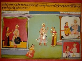 | Description / विवरण | Miniature painting based on Prithviraj Raso depicting after staying the whole Shravan and Pus month with Indravati going near Savti in the autumn season. |