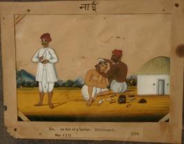 | Description / विवरण | Miniature painting depicting a barber cutting the hair of a man. Another man is seen standing beside them. |