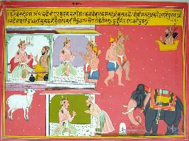 | Description / विवरण | Miniature painting based on Harivansha depicting on the upper right part Narad and Kansa in conversation. Next to it Kansa talking to Chanur and Mustaka. At the lower part Kansa is talking with the elephant rider. The elephant is seen at the left lower corner. |
