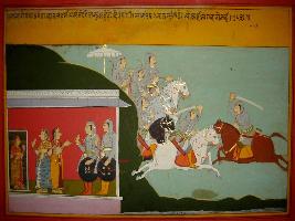 | Description / विवरण | Miniature painting based on Prithviraj Raso depicting Rawal Hamir saying to Sanjogita that one noble fought against 80 lakh soldiers without fleeing from the battlefield. |