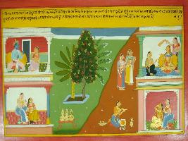 | Description / विवरण | Miniature painting based on Mahabharat - Virat parva depicting Draupadi says that she is Sairandhari and she dress up the hair of Satyabhama and Draupadi and now she coming to her. The Sudesana says that, male female even bulls are attracted in her beauty. |