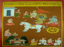 | Description / विवरण | Miniature painting based on Shri Bhagwat Gita. It depicts Krishna preaching Arjun that the person who does work without the expectation of it result in saint. |