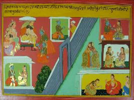 | Description / विवरण | Miniature painting based on Mahabharat - Adi parva depicting Arjun coming to Yudhisthir and touching his and Kunti s feet and meeting Draupadi. |
