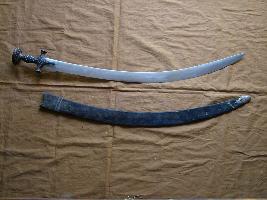 | Description / विवरण | Sword which blade is made of stainless steel and hilt is made of brass. The blade is narrower gradually towards tip and one edge of it is sharped. Hilt is coloured with black colour and lots of floral designed knobs. It is with scabbard which in made of wood and covered with black coloured velvet cloth. |