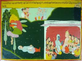 | Description / विवरण | Miniature painting based on Mahabharat - Gada parva, Duryodhan is depicted lying dead on the sands of bank. Arjun is depicted talking to Dritarastra and Gandhari. |