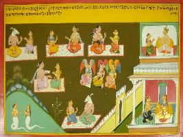 | Description / विवरण | Miniature painting based on Mahabharat - Virat parva depicting Sudesana says Draupadi that Yaksha, Devas, Gandharvas, Snakes, Vidyadhars all have their wives and among them above wife you are. |