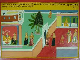 | Description / विवरण | Miniature painting based on Mahabharat - Virat parva depicting nobody in the court accept Draupadi as Sairandhri. At the moment queen Sudesana saw her and ask her who is she. Draupadi introduce herself as Sairandhri bu Sudesana says that she does not look like a servent, she must be a daughter of some aristrocratic family. |
